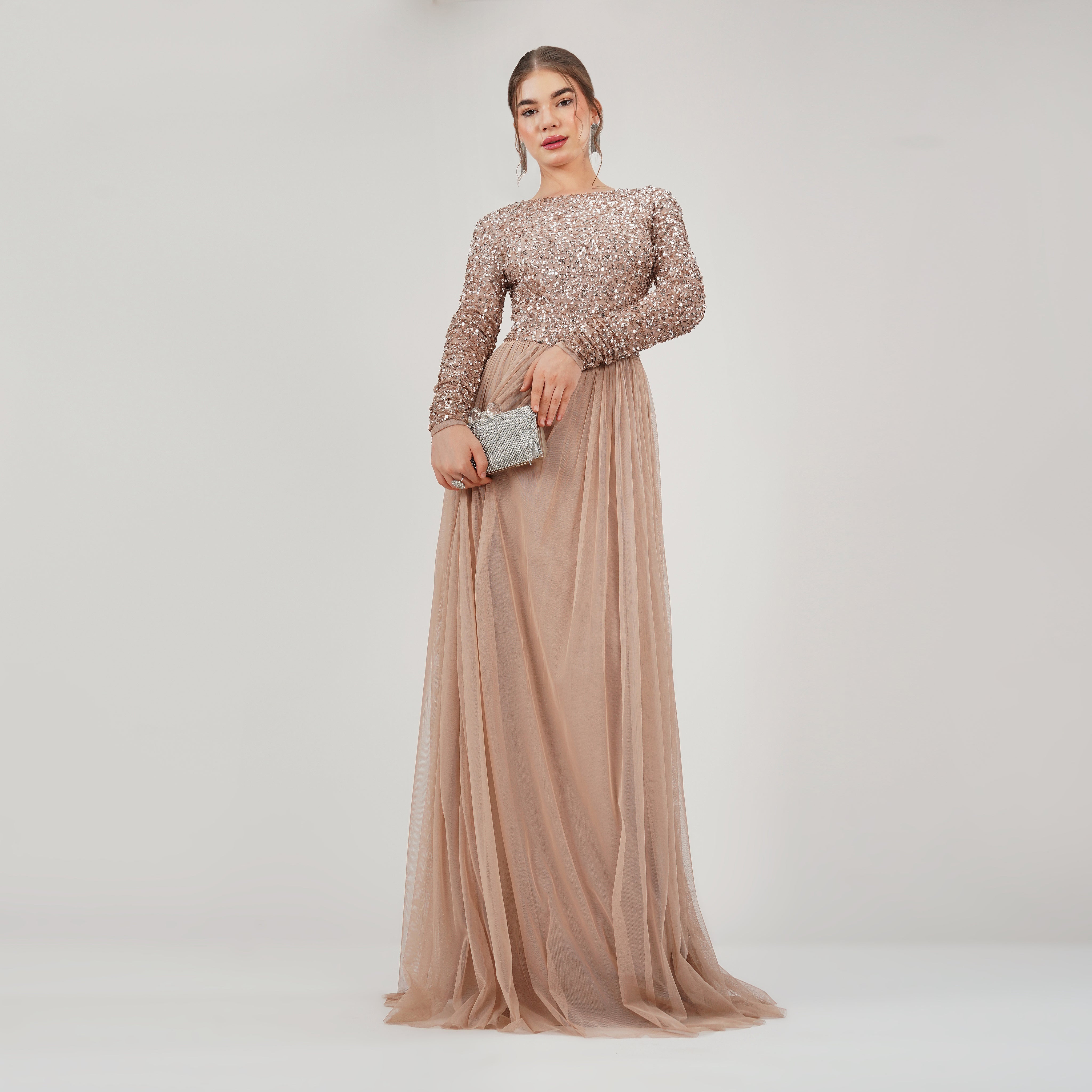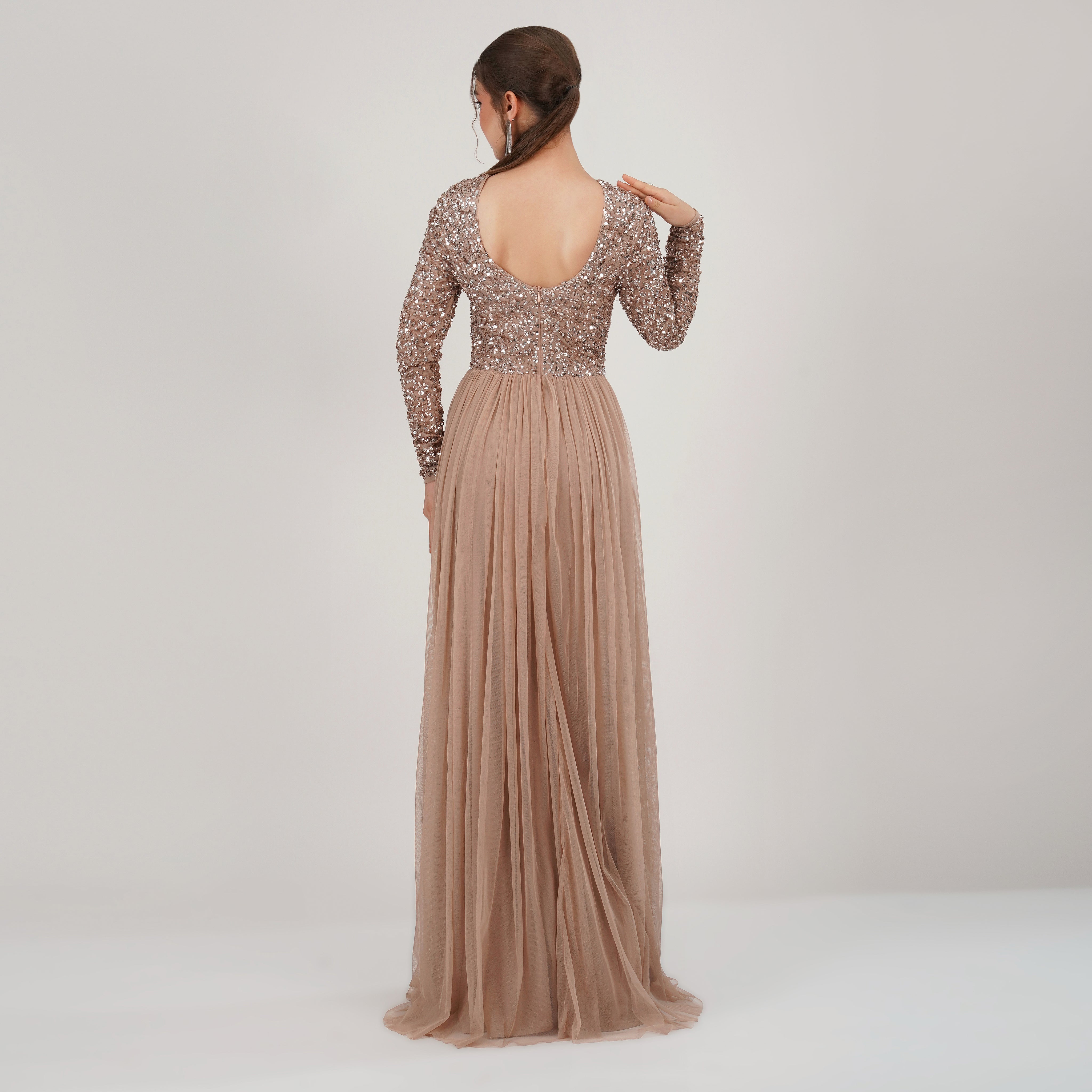 ✨ Bodice: Full sequin detailing, long sleeves