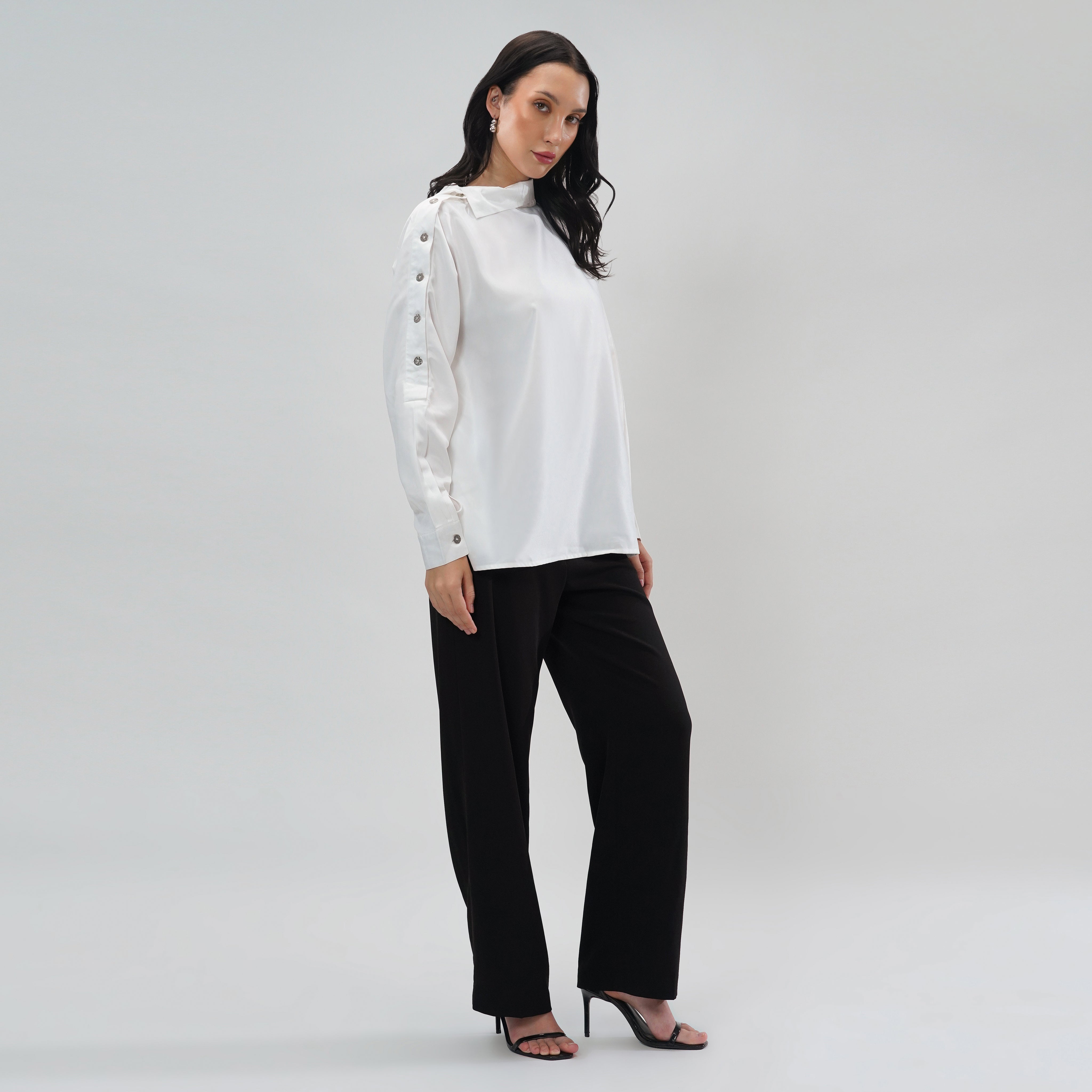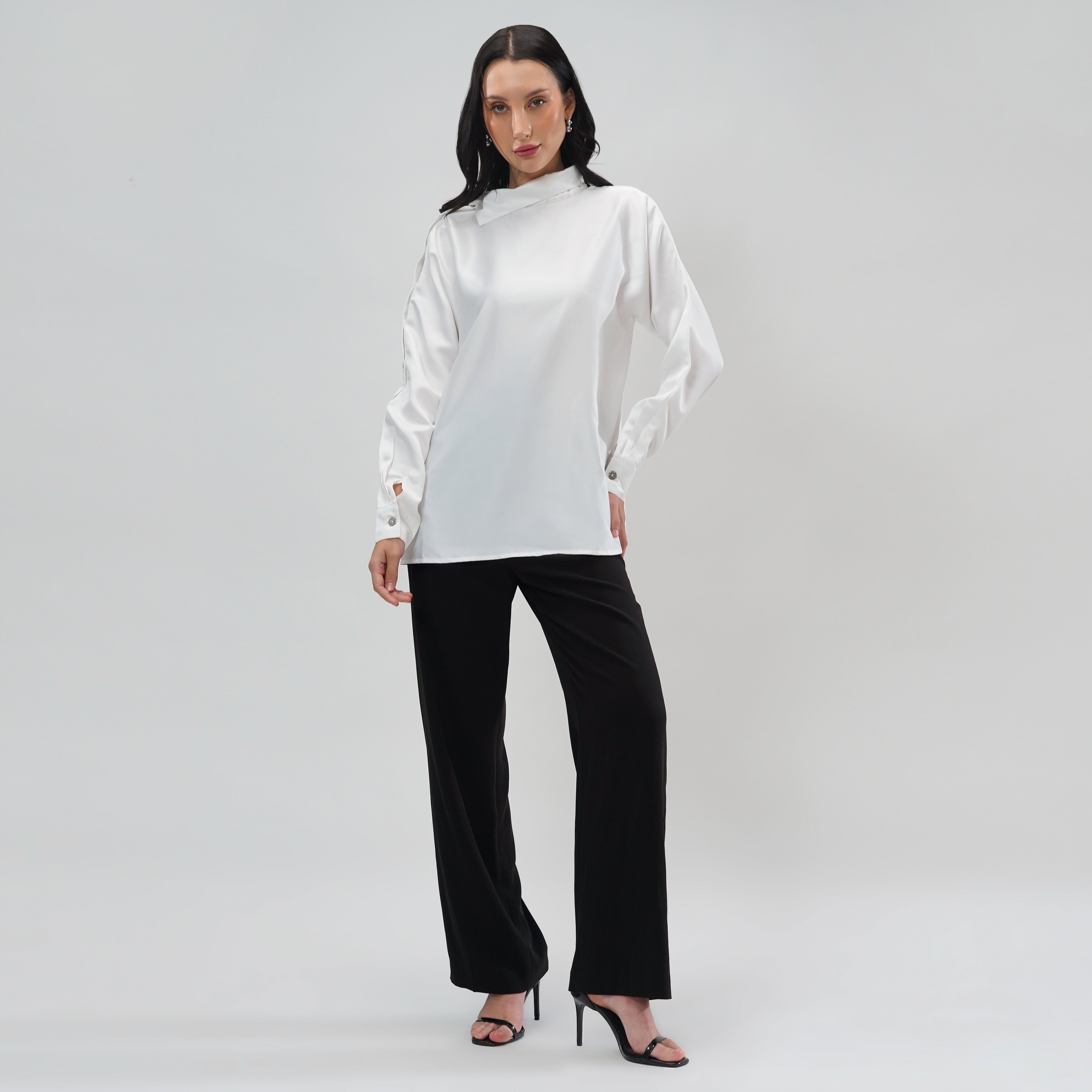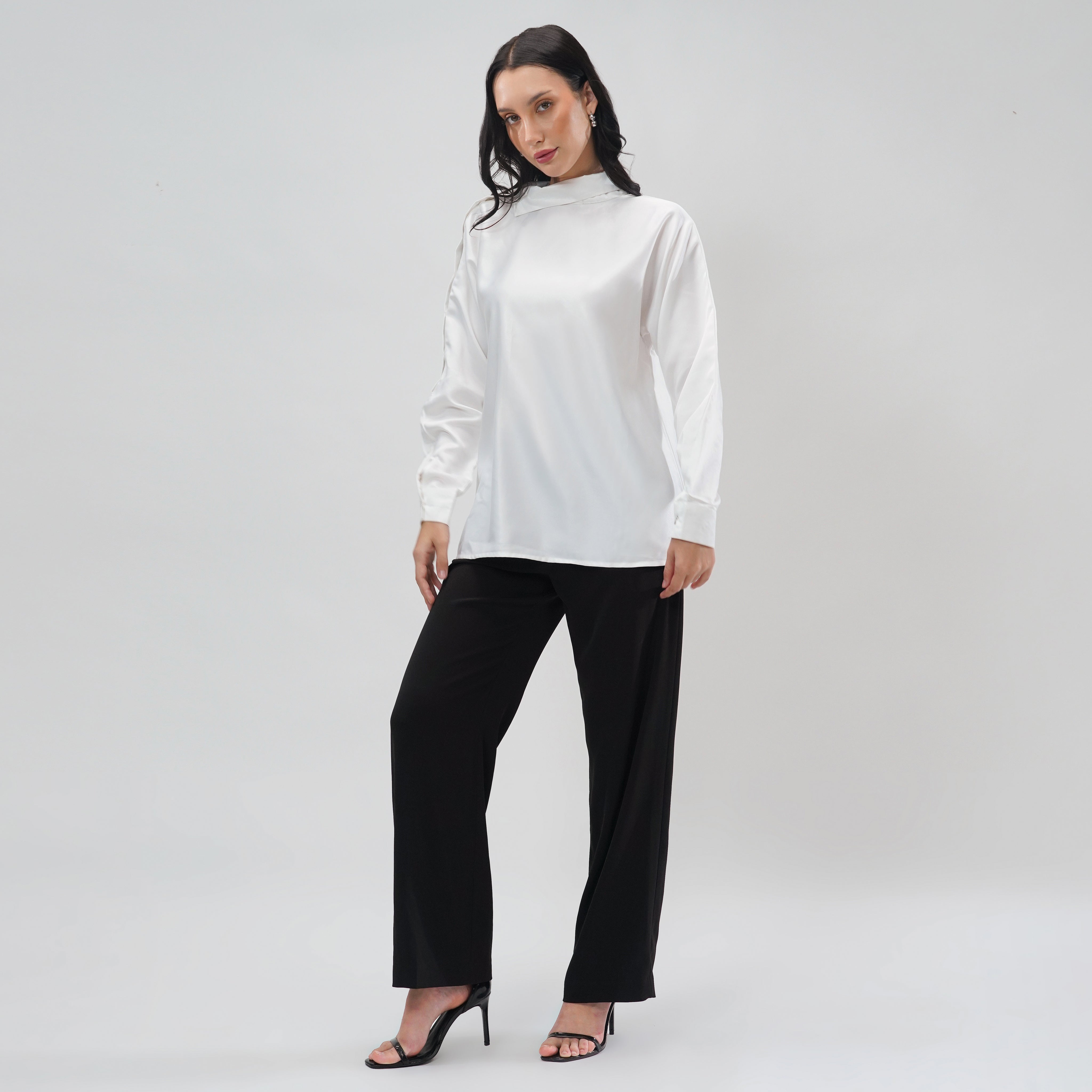 Simple yet sophisticated, this white satin Shirt brings a touch of elegance to your everyday wardrobe ✨. Featuring a high neckline with delicate detailing and long sleeves, it’s the perfect blend of minimal and chic.