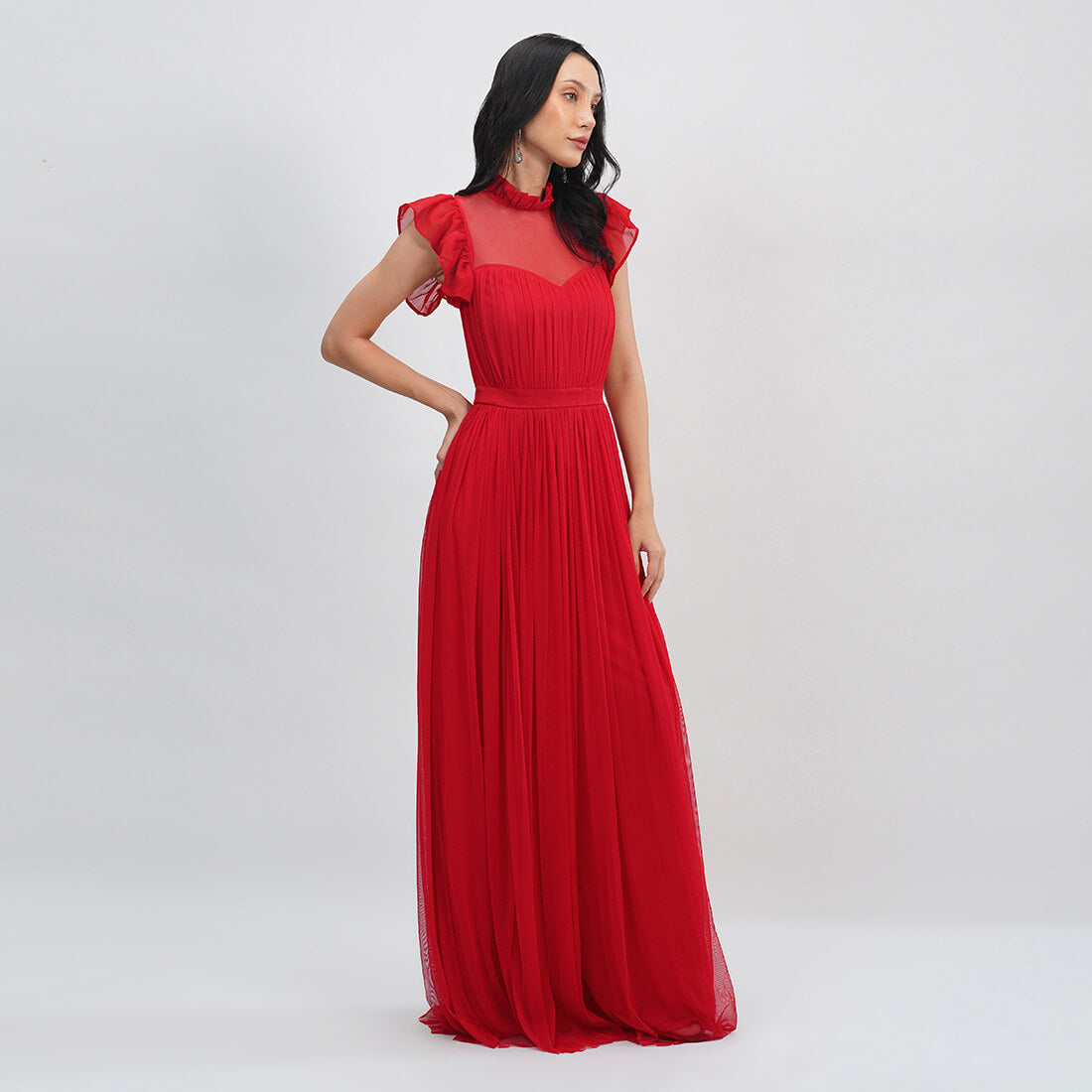 Turn heads effortlessly in this vibrant red maxi dress 🔥. Designed with soft pleats, flutter sleeves, and a sheer neckline, it blends elegance with everyday comfort. The flowy silhouette makes it a versatile pick — perfect for dinners, casual parties, or festive celebrations.