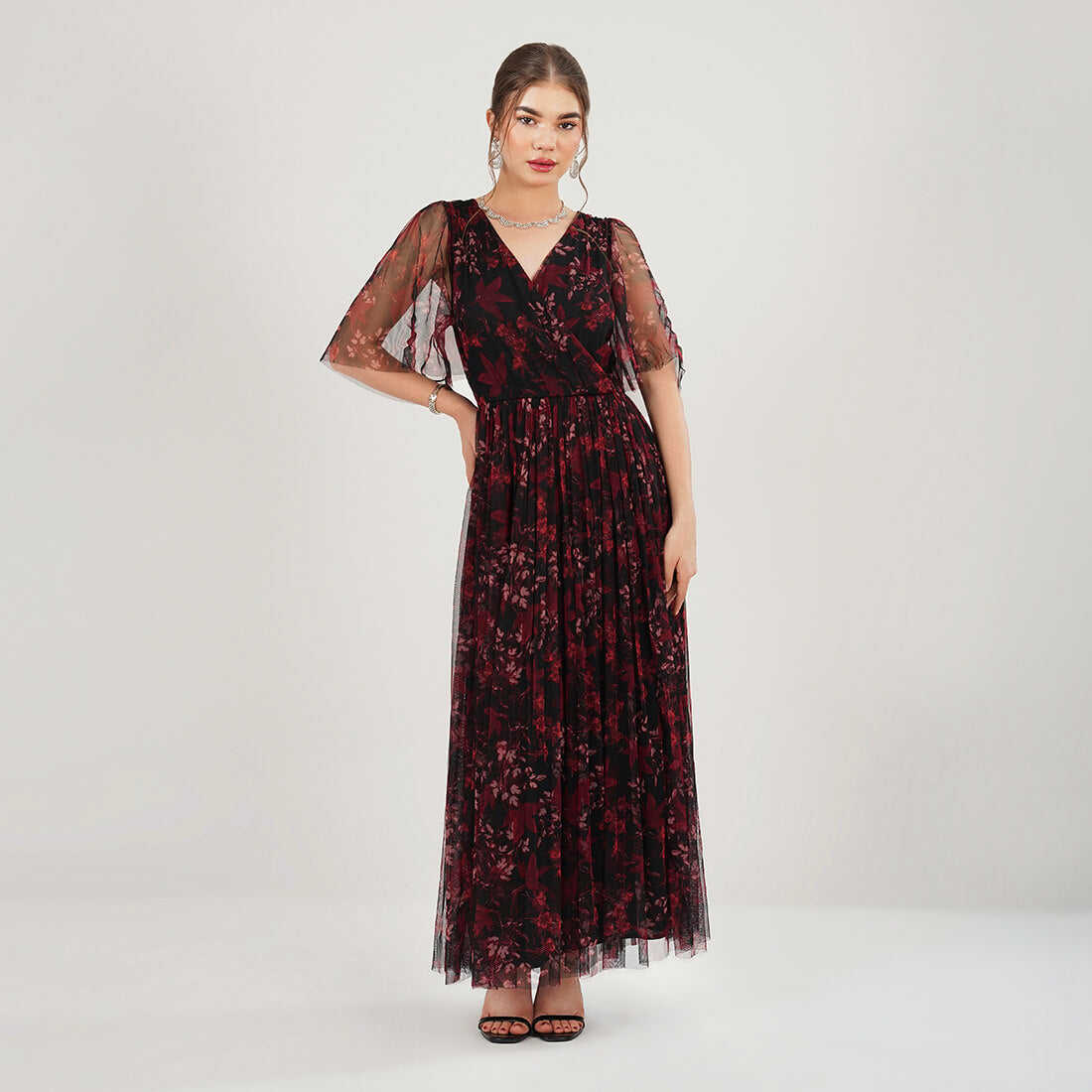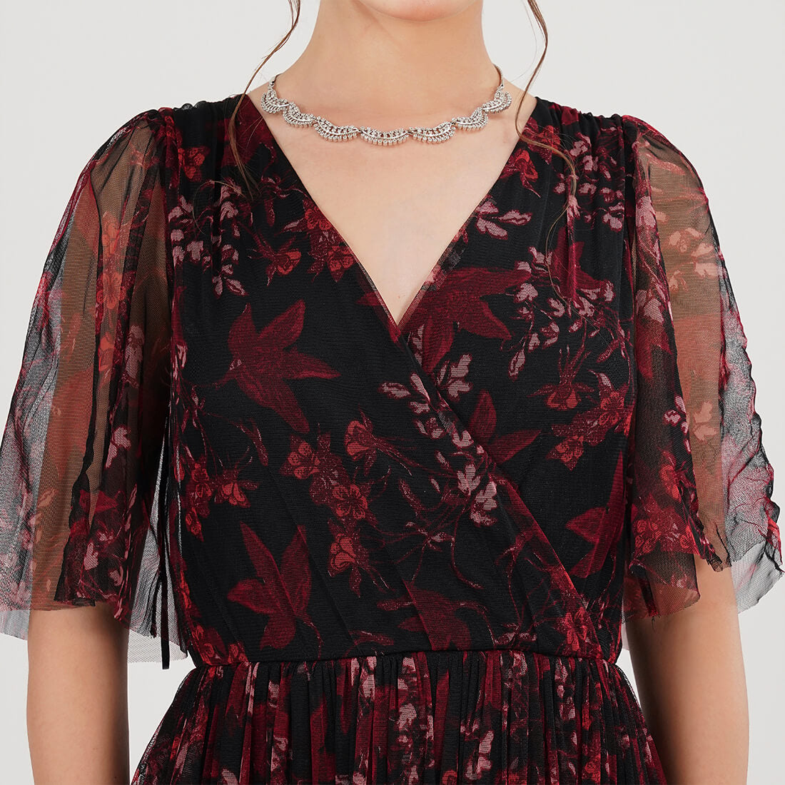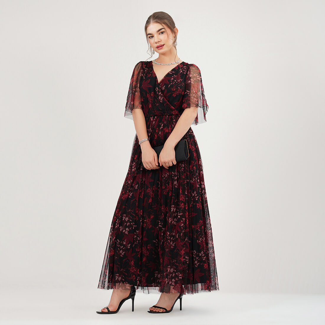 A flowy burgundy maxi dress with sheer sleeves and floral prints, perfect for casual parties, dinners, and evening outings.