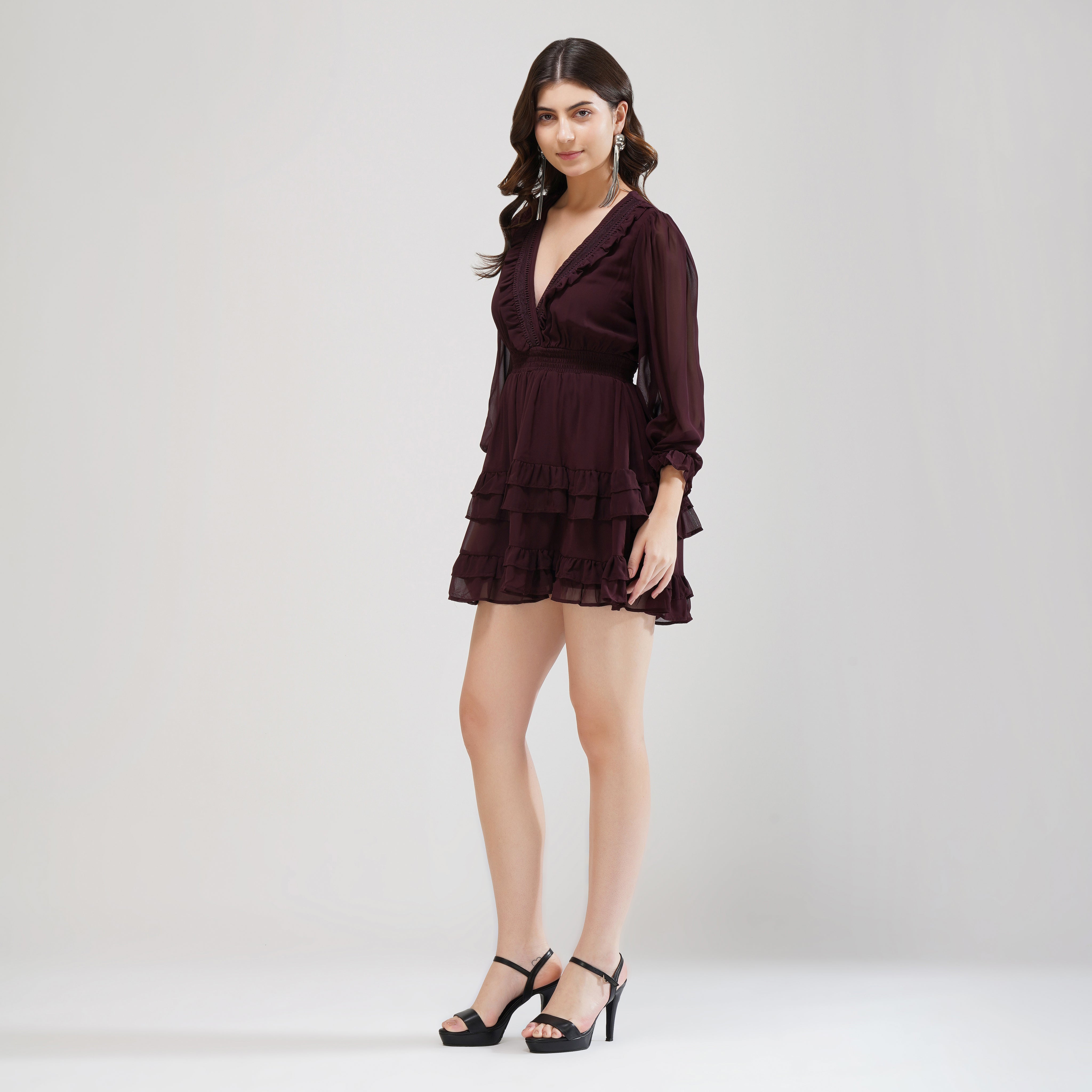 This dress brings a soft, romantic vibe with its wrap-style neckline and layered ruffle detailing. The sheer sleeves add a touch of elegance while keeping the look light, and the elasticated waist gives a flattering shape without compromising comfort. The flowy hemline moves beautifully with every step, making it perfect for dinners, dates or evening outings. Style it with statement earrings and heels for an effortlessly feminine look.