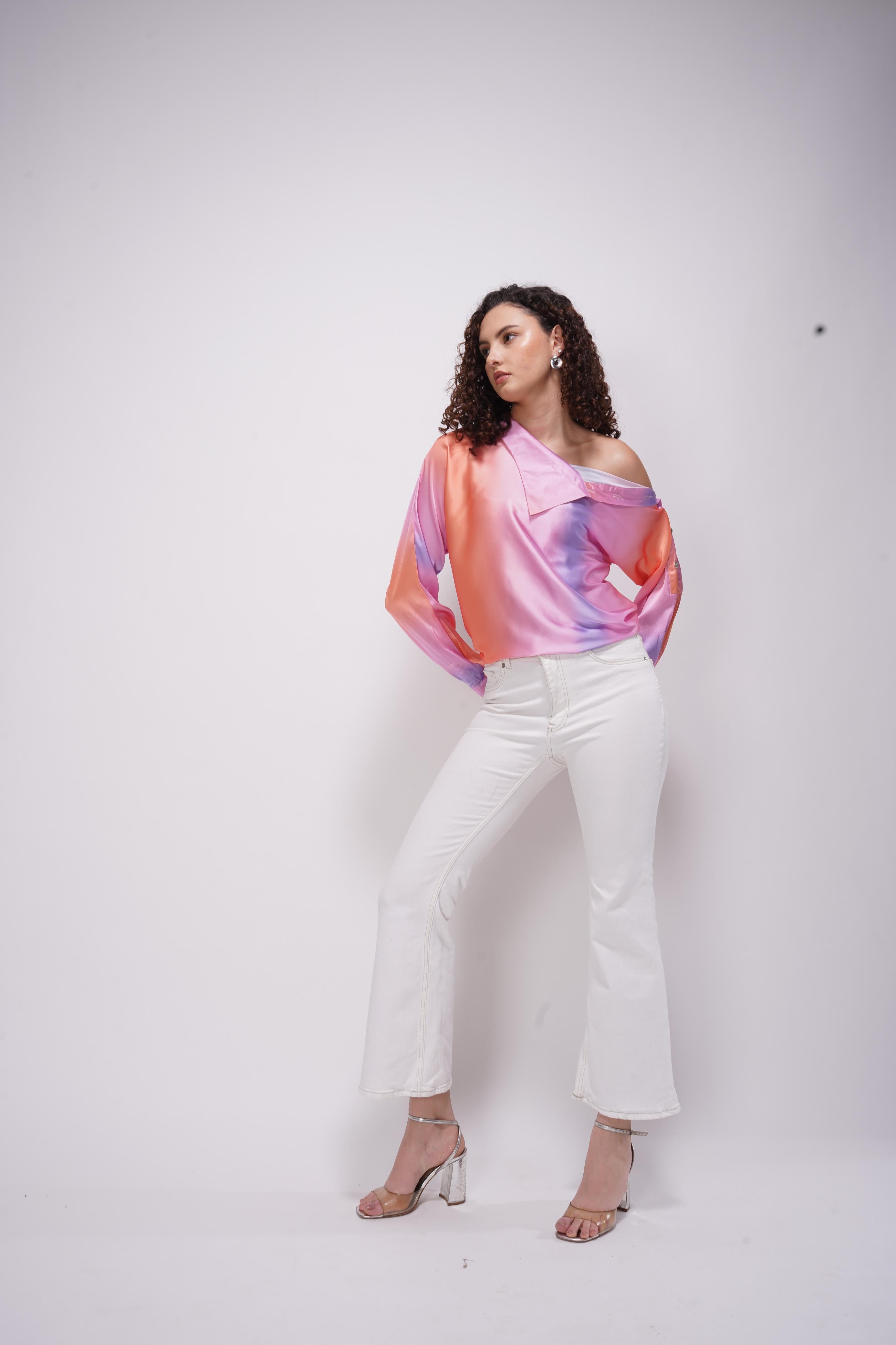 This shirt brings a soft, fluid look with its satin finish and relaxed off-shoulder drape. The playful colour blend gives it a fresh, standout appeal while still keeping the silhouette clean and easy to style. It sits comfortably on the body and pairs well with jeans, trousers or skirts for a chic day or evening look. Add heels and simple jewellery to complete the outfit with a touch of polish.