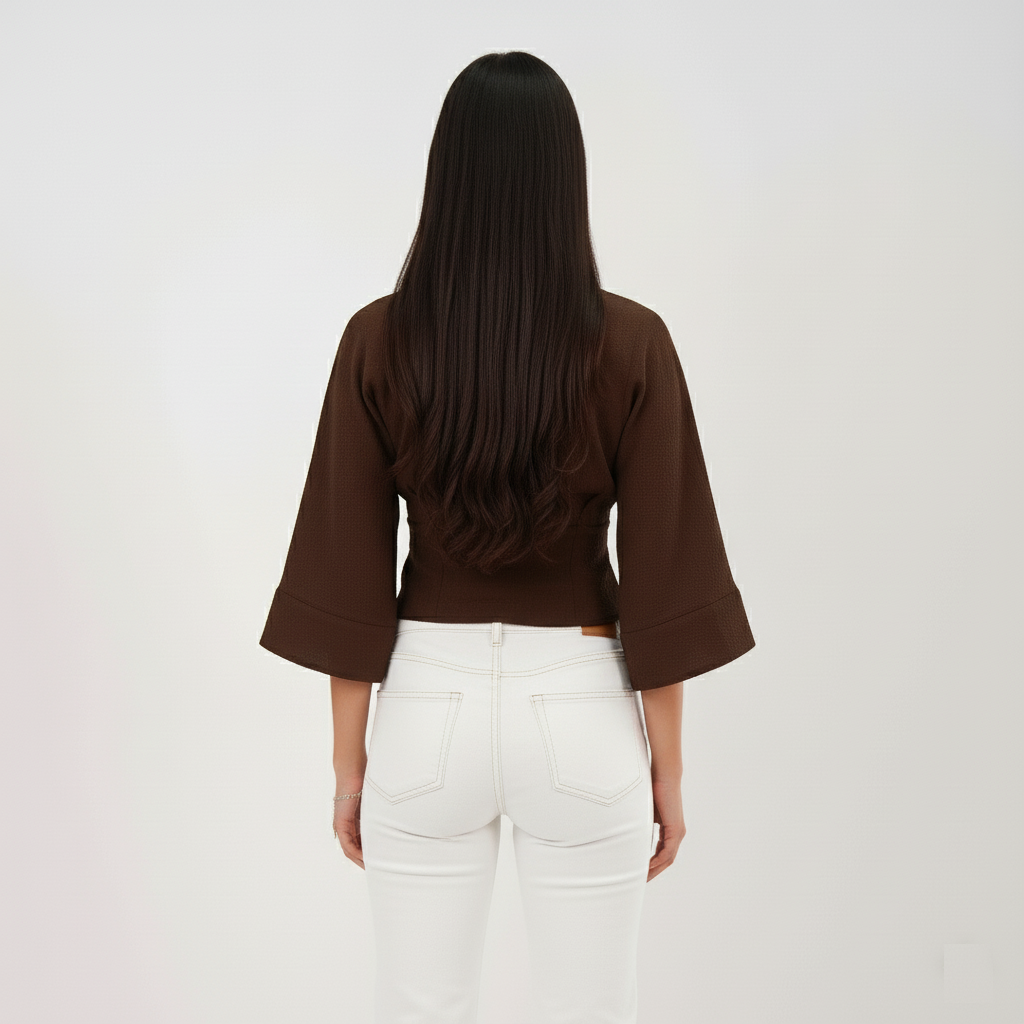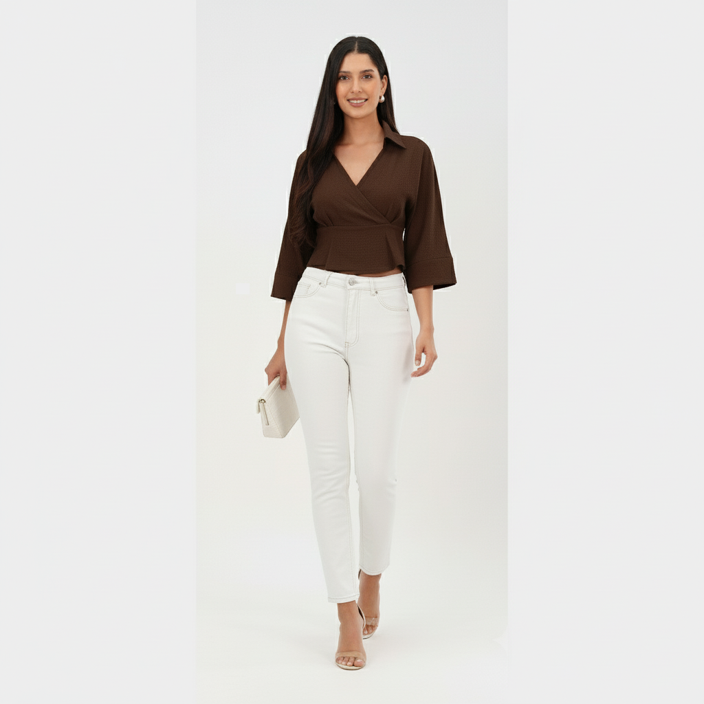 A chic chocolate brown wrap-style crop top with a collared neckline and flared sleeves. Stylish yet versatile — perfect to pair with jeans, skirts, or high-waisted trousers for a smart-casual look.